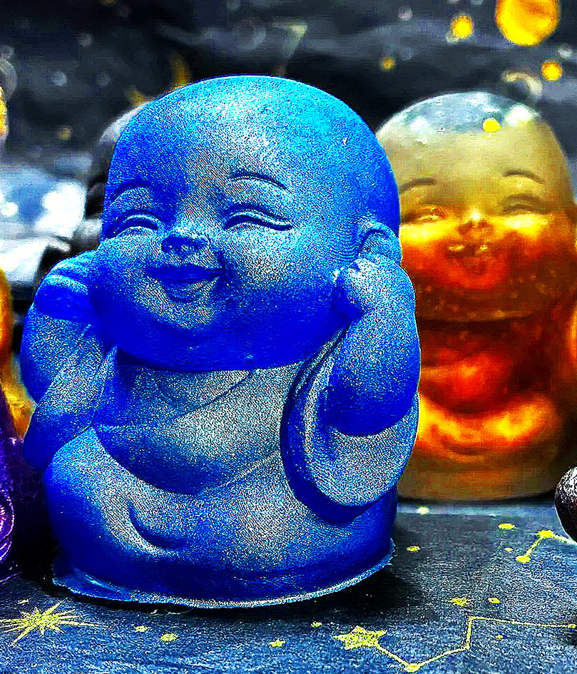 This small monk sits in quiet contentment, hands gently covering his ears — a reminder of the ancient wisdom: hear no evil.